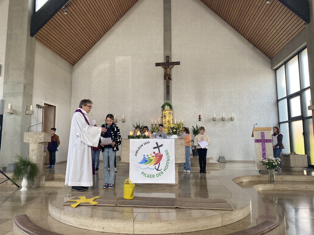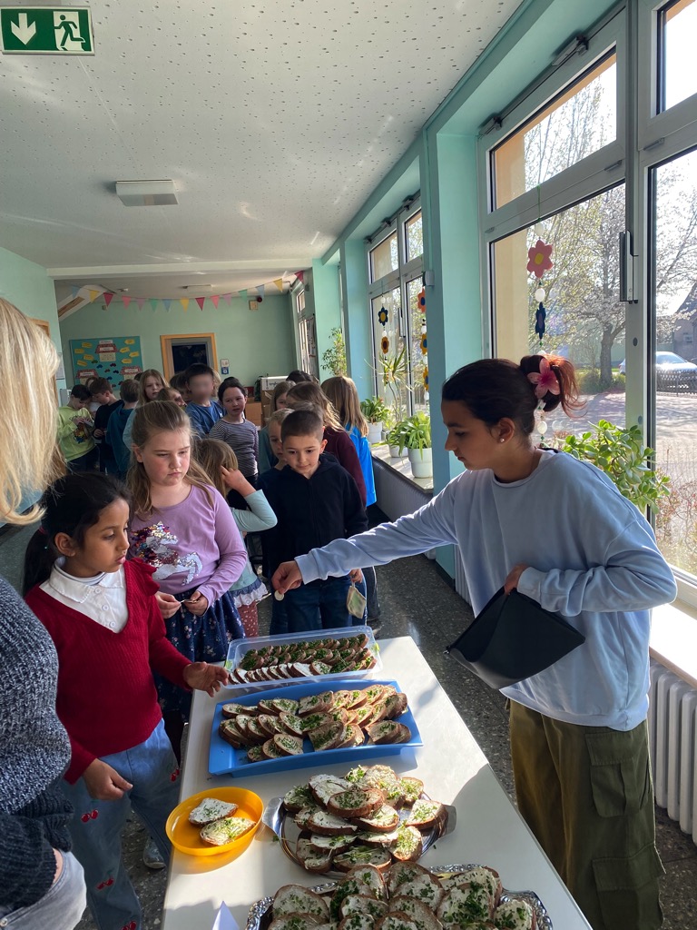 Auch in diesem Jahr nahmen sich die Grundschülerinnen und Grundschüler der Grundschule Kolitzheim die Fastenzeit zum Anlass, für den guten Zweck am letzten Schultag vor den Osterferien auf ihr Pausenbrot zu verzichten. Anstatt eine eigene Brotzeit mitzubringen, erwarben die Kinder Äpfel und leckere Brote mit Butter, Frischkäse und Kräutern, die von einigen Klassen liebevoll für die gesamte Schulfamilie zubereitet und anschließend in der Esspause verkauft wurden. Dank einer großzügigen Lebensmittelspende von REWE Götzelmann, ist es der Grundschule Kolitzheim möglich, den gesamten Erlös von 575€ zu spenden. In diesem Schuljahr kommt er der Solibrotaktion zu Gute, die damit Pfr. Silverius Mwingira und sein Bistum Mbinga in Tansania dabei unterstützt, in Nkile am See von Malawi/Njassasee einen Kindergarten zu errichten. Über den diesjährigen Spendenzweck informierte unser Pfr. Thomas Amrehn, der seit vielen Jahren mit Pfr. Mwingira verbunden ist, im Ostergottesdienst die Schulklassen und Lehrkräfte. Gemeinsam wurde zudem ein afrikanisches Lied gesungen.