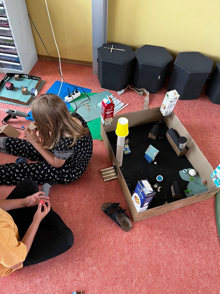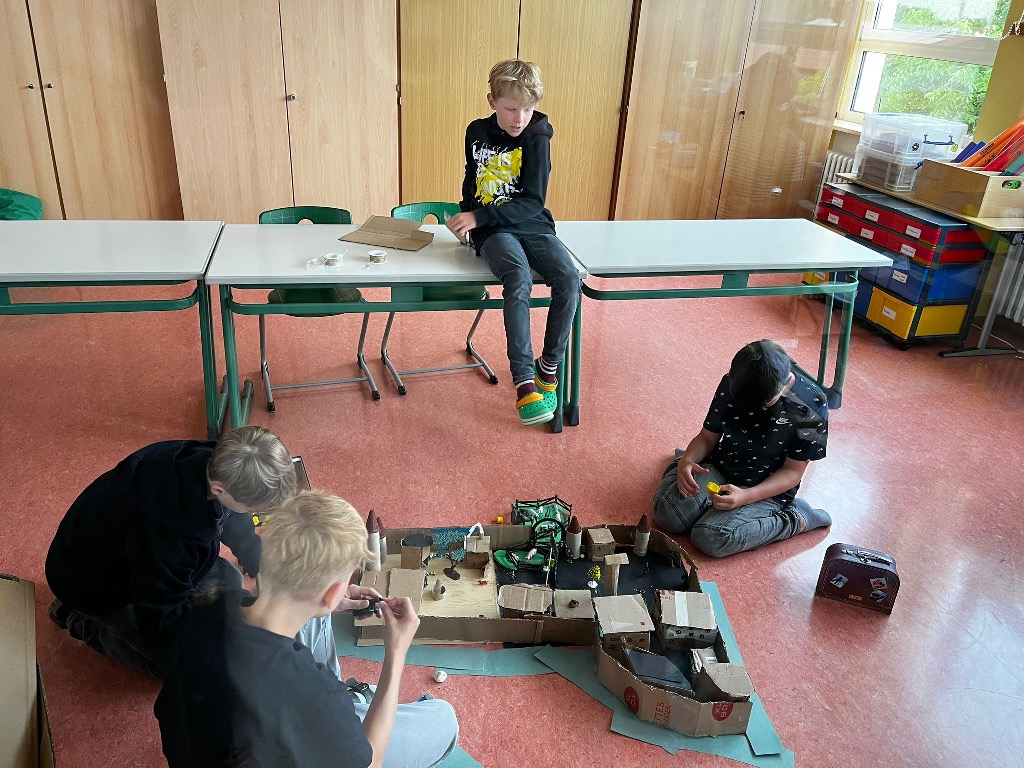 Anschließend planten die Kinder in ihren Gruppen den Aufbau ihrer Stadt. Die Kinder arbeiteten in kleinen Gruppen und waren verantwortlich für verschiedene Bereiche: Einige bauten die Stadtmauer aus Pappkarton und gestalteten stabile Türme, andere entwarfen detailreiche Fachwerkhäuser aus Milchkartons und Verzierungen aus Papier.