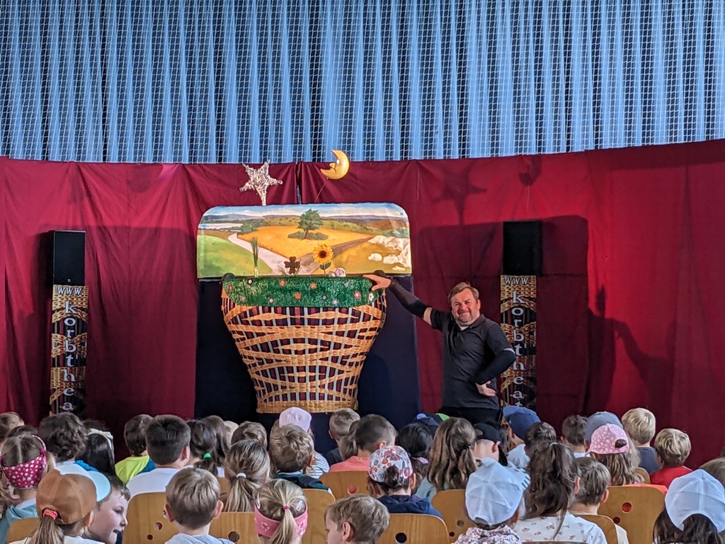 Ende Mai kamen alle erste bis dritten Klassen der Grundschule Kolitzheim in den Genuss des Korbtheaters „Olga packt aus“. Alfred Büttner thematisierte mit seinen Handpuppen auf sehr witzige und unterhaltsame Art und Weise Abfallvermeidung und nachhaltiges Handeln. Lautstark und mit viel Begeisterung sangen die Kinder die zuvor im Unterricht eingeübten Lieder der tierischen Hauptdarsteller mit.